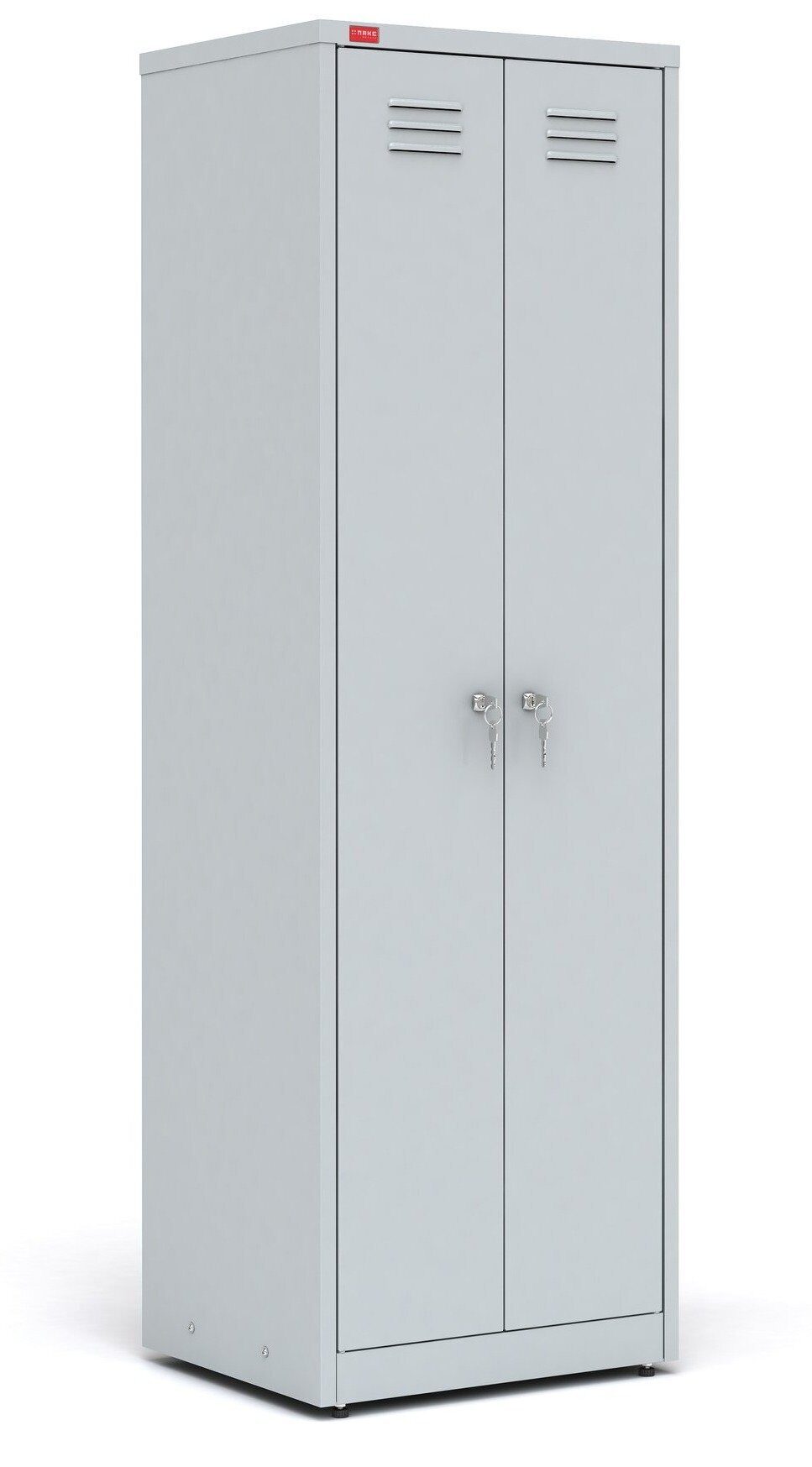 Шкаф разборный металлический двухсекционный, для хранения сменной одежды и документов. В одном отделении: полка для головного убора, перекладина для вешалки и крючки для одежды, врезной замок. В другом: четыре регулируемые по высоте полки, врезной замок.